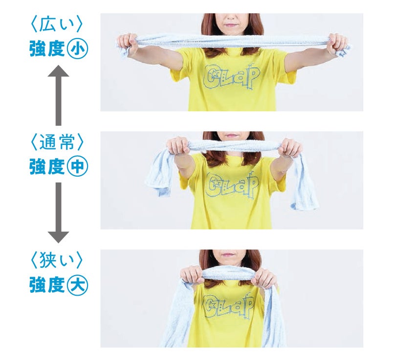 肩幅より少し両側に開いた位置が、オーソドックスなタオルの持ち手になります。さらに、持ち方を工夫することによって、ストレッチをしたときの伸び方が変わります。基本的に、タオルを広く持つと強度はゆるまり、狭く持つと強度は強くなります。各部位に痛みがある人や体が硬い人は、まずは広く持ってやってみてください。より伸ばしたい人、より柔らかくしたい人は、徐々に持つ手を狭めていきましょう。無理はせず、ストレッチによる痛みを感じないところで止めて、気持ち良く伸びている感覚があれば正解です。