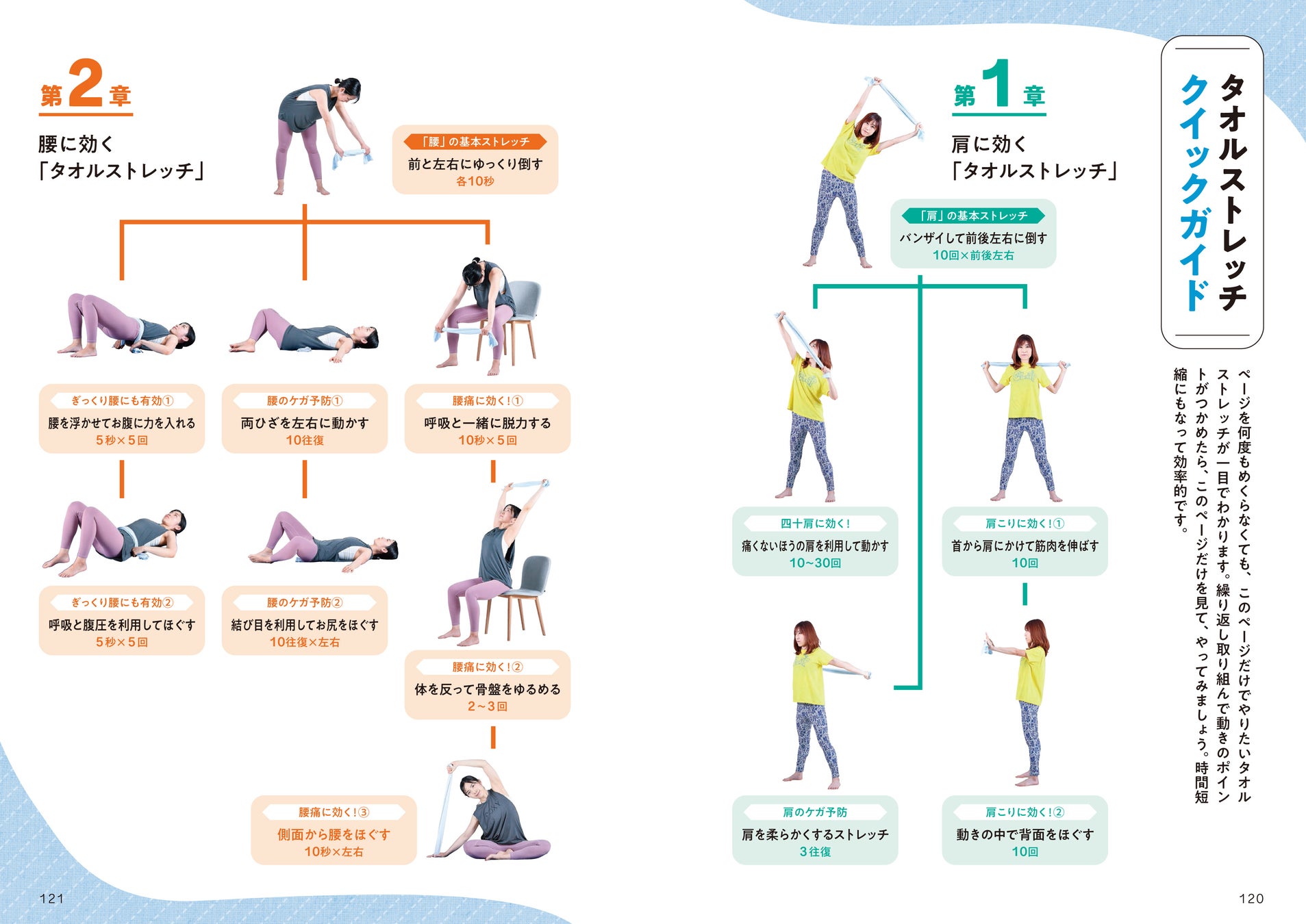 ページを何度もめくらなくても、やりたいタオルストレッチが一目でわかる、クイックガイドも用意しています。繰り返し取り組んで動きのポイントがつかめたら、このページだけを見て、やってみましょう。時間短縮にもなって効率的です。