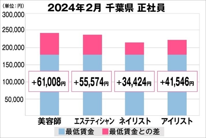 2024年2月時点で『美プロ』に掲載されている「千葉県」の「美容師・エステティシャン・ネイリスト・アイリスト」求人における「正社員」「アルバイト・パート」の給料を抽出。