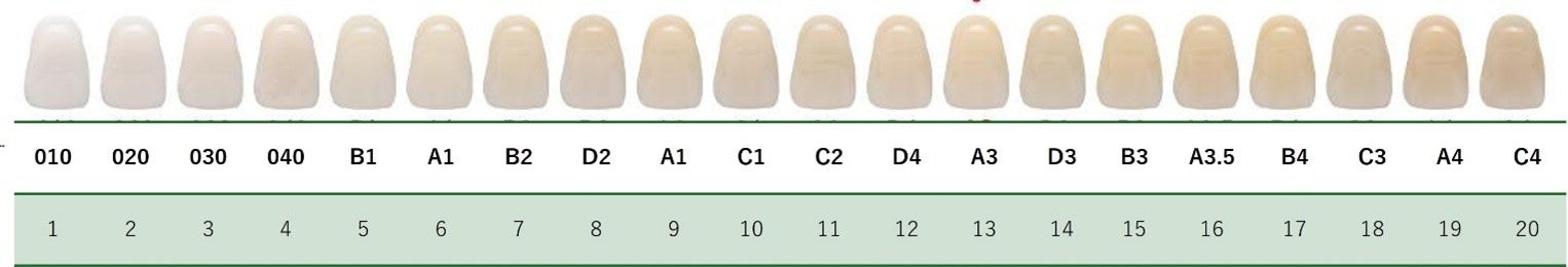 ※歯の色の参考としては、以下のシェード表をご確認ください。通常、歯科医院では010~C4の表記を用いておりますが、このたび、分かりやすく表記するため全項目において数値を使用いたします。数値が大きくなるほど歯の色の黄ばみは強くなります。