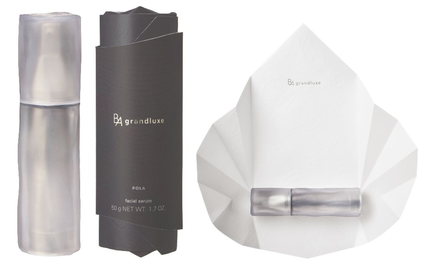 「B.A グランラグゼ Ⅳ」は、ポーラブランドの中で最高峰の乳液を兼ねた美容液で、「無意識の覚醒による感受性の広がり」をコンセプトに、没頭・没入する行為や静の時間を、人の手が創り出す画一性の無い有機的な造形により、感触、多様にうつろう表情としてデザインに込めました。包装は、日本古来からの“折って包む”文化を取り入れ、1枚の紙を精巧に折り上げ、一つ一つを手作業で包んで作られる、新発想の包装を開発。廃棄される包材のミニマム化とともに、「人の手」による感受価値と美しさを追求しました。