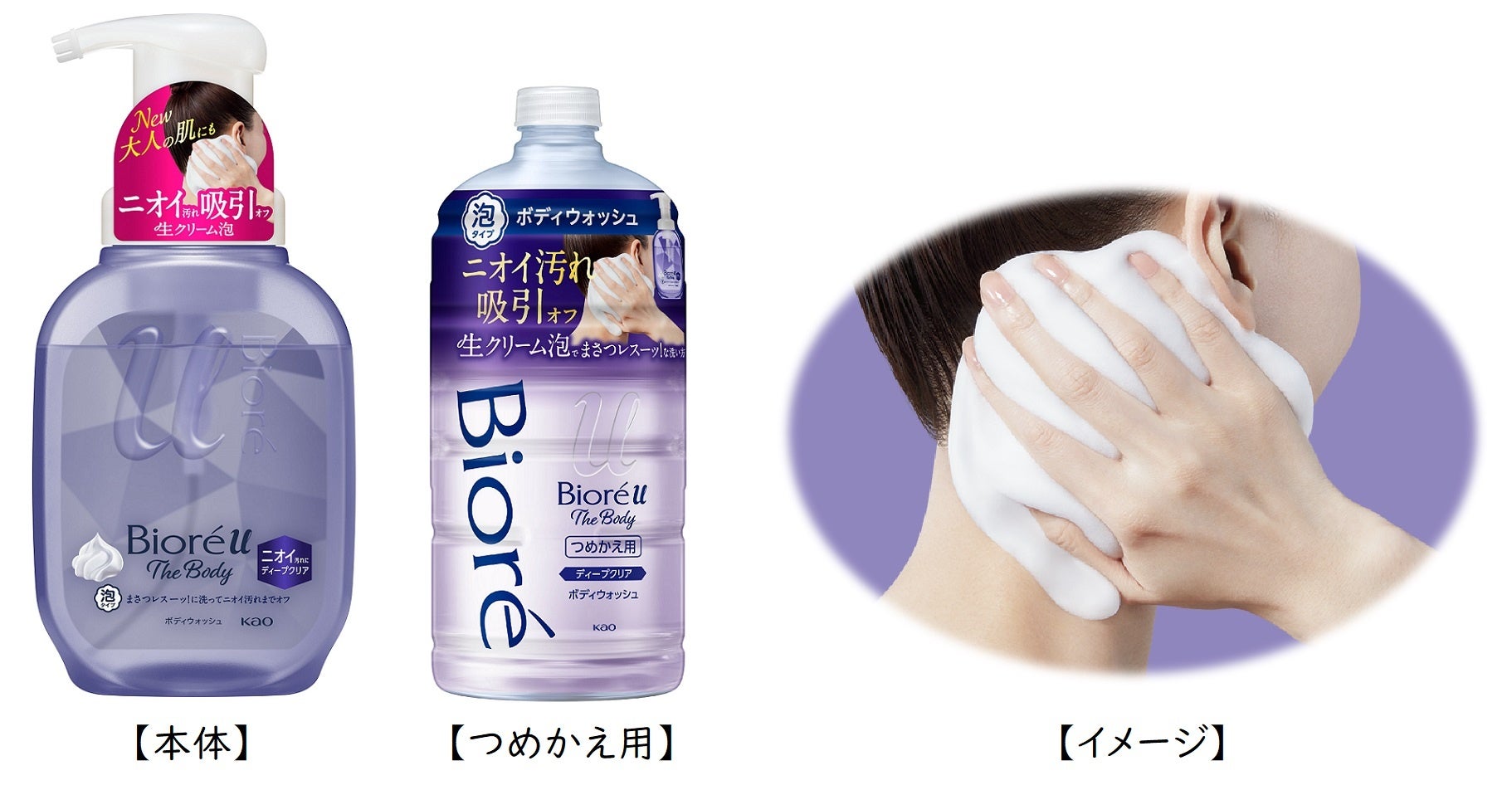 そこでこのたび、“まさつレス”な手のひら洗いを一貫して提案してきた「ビオレu ザ ボディ」シリーズから、1年中ニオイ汚れが気になる方に、『ビオレu ザ ボディ 泡タイプボディウォッシュ ディープクリア』を改良新発売します。「ニオイ汚れ吸引オフ生クリーム泡」が触れるだけで、ニオイの元となる皮脂汚れを吸引し、洗い流します。長持ち泡が洗浄時のまさつを低減するので、かさつきがちな肌も “まさつレス”にやさしく洗えます。