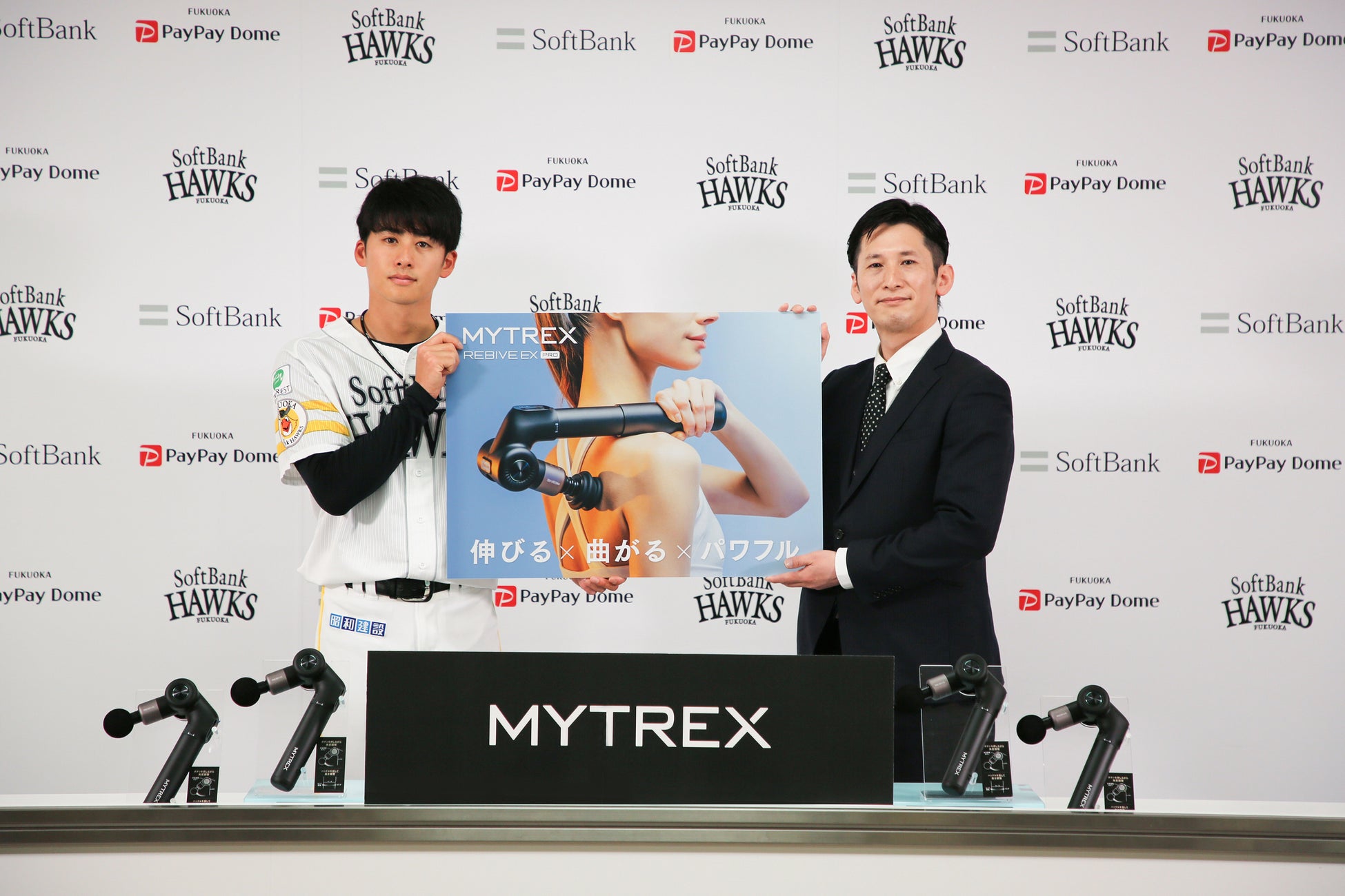 今年も引き続き、福岡ソフトバンクホークス選手のみなさまのセルフケア・ボディメンテナンスのサポートを全力でさせていただきたく、この度2月に発売したばかりの新商品「MYTREX REBIVE EX PRO」を贈呈させていただきます。