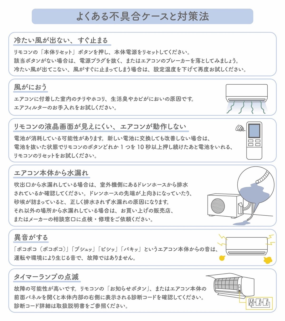 その他エアコン試運転時の不具合解決方法につきましてはパナソニックの下記公式サイトをご参照ください。