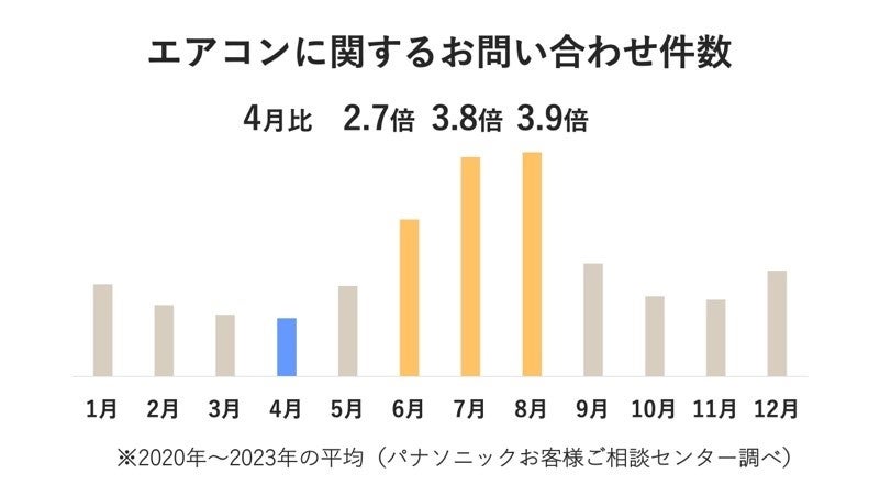 昨夏エアコン試運転を行った方に、試運転を行ったタイミングについては、6月が最も多く29%という結果に。しかし、パナソニックお客様ご相談センターに寄せられるエアコンに関する相談については、例年6月~8月にお問い合わせが集中しており、過去4年(2020年~2023年)の平均では、4月のお問い合わせ件数と比較すると6月が2.7倍、7月が3.8倍、8月が3.9倍と3倍〜4倍近くまで急増しています。