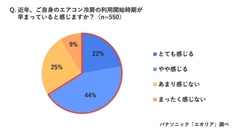また、「近年、ご自身のエアコン冷房の利用開始時期が早まっていると感じますか」という質問では、「とても感じる」(22%)、「やや感じる」(44%)と、66%がエアコン利用開始の早まりを感じているようです。エアコン試運転は、室内温度より3℃以上低くして冷房運転を試すため、気温が20℃になる頃が目安です。例年4月〜5月頃に20℃に到達する地域が多いため、今年は4月〜5月の早めの試運転を心がけてみましょう。