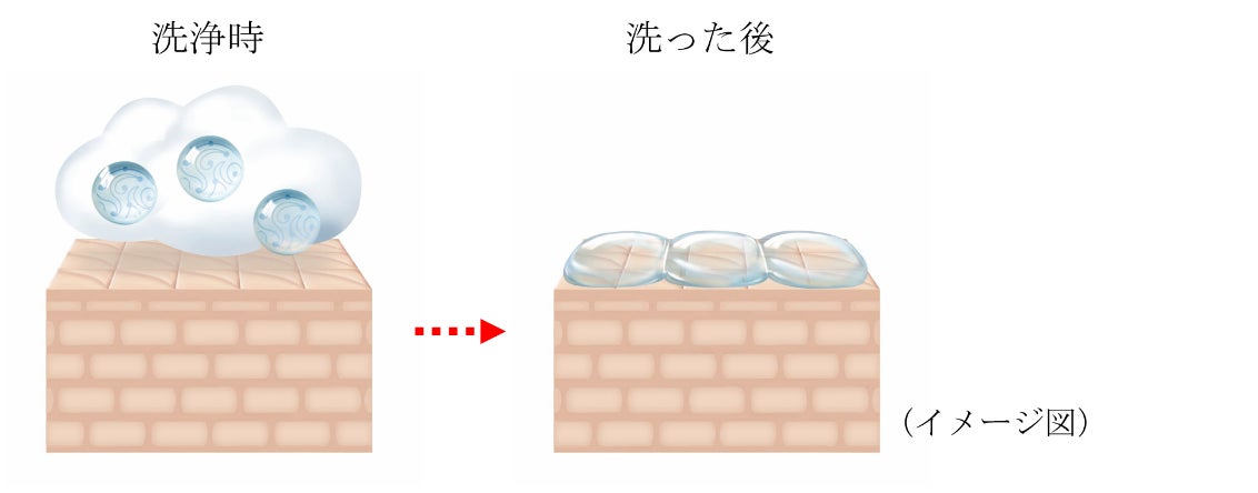 洗浄時に水に触れると、保湿成分が肌に吸着しやすい形(保湿成分複合体)に変化します。洗浄後は保湿成分複合体が肌にしっかり吸着し、肌をベールのように覆うので、洗うたびに肌にうるおいを与えます。