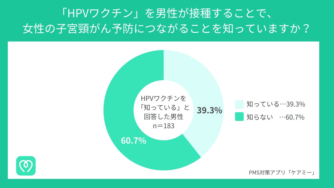 「知っている」と回答したのは39.3%、「知らない」と回答したのは60.7%。HPVワクチンの存在は認知していても、そのうち6割は、男性が接種することが女性の子宮頸がん予防につながることを知りませんでした。