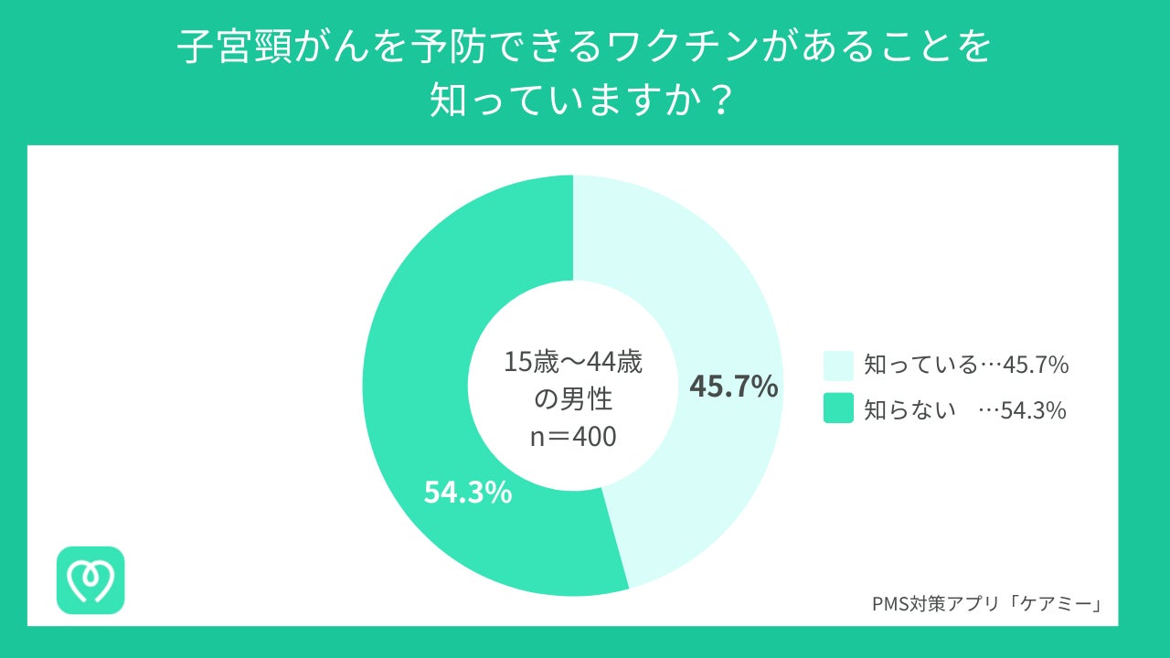 45.7%の男性が「知っている」、54.3%の男性が「知らない」と回答。半数以上の男性が子宮頸がんを予防できるHPVワクチンの存在を認識していないことが明らかになりました。