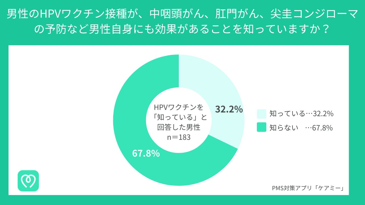 「知っている」と回答したのは32.2%、「知らない」と回答したのは67.8%。男性がワクチンを接種することで、HPVが原因となる中咽頭がん、肛門がん、尖圭コンジローマなどの予防に効果が期待できます(※2)。 自分自身の健康に影響するにも関わらず、約7割の男性が、HPVワクチン接種による効果を認識していませんでした。