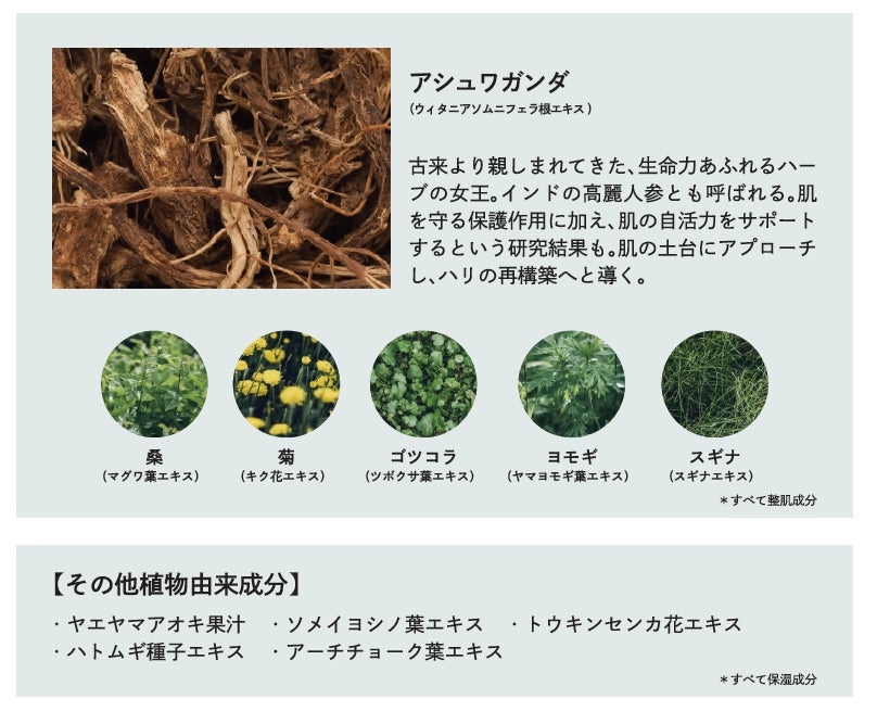 大人肌のためのバイオレチノール*をメインに、アシュワガンダを始めとする6種の東三河産植物エキスを黄金比配合。ピンと張ったような上向きハリ肌に導く、エイジングケア**化粧水。