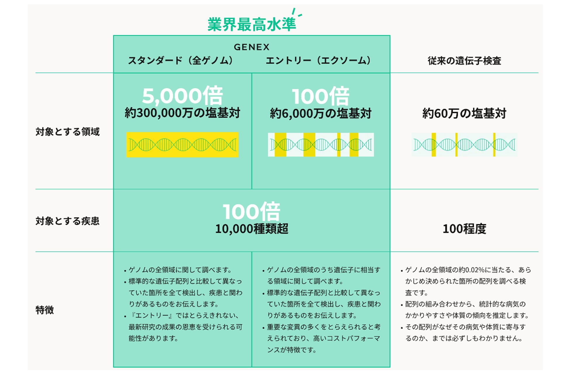 ジーネックスは、ゲノム医療推進法の成立を機に差別防止や相談支援の環境整備が進むことを見据え(※解説2)、前記の特長あるサービスを通じて、ゲノム解析技術の恩恵をより多くの方へお届けします。『ジーネックスのゲノム検査 エントリー』(税別29,800円、税込32,780円)は、従来の遺伝子検査の10~100倍に当たる6,000万塩基対を調べることで人間が持つ全遺伝子の重要領域をカバーし、『同 スタンダード』(税別59,800円、税込65,780円)は、そのさらに50倍の30億塩基対を調べることで全ゲノムをカバーします(図)。