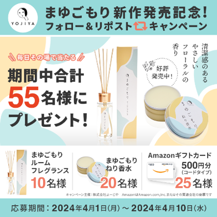 キャンペーン期間中によーじや公式Xアカウントをフォローのうえ、対象の投稿をリポストしていただくだけで、新発売の「まゆごもり」アイテムや「Amazonギフトカード」が当たるうれしいキャンペーンです。