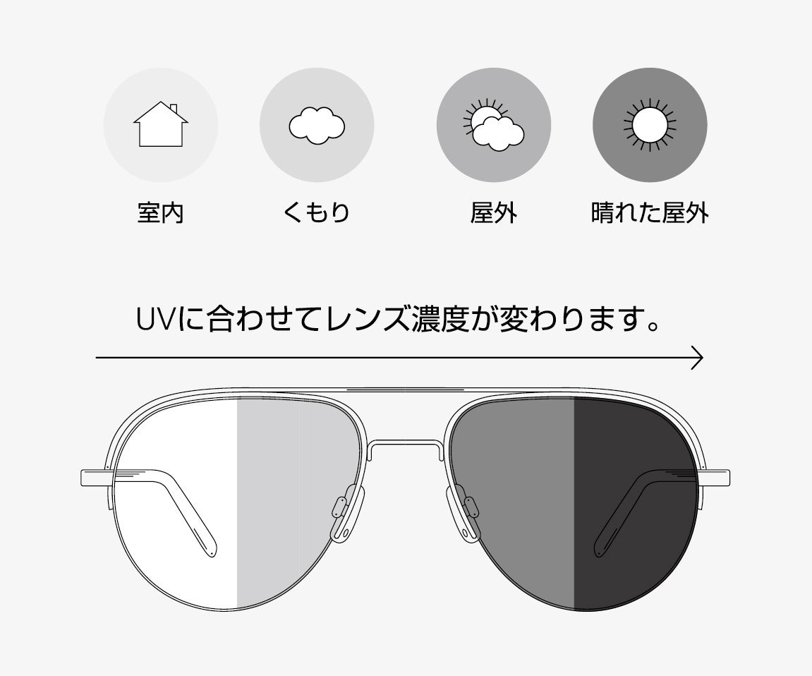 紫外線量に反応してレンズの色が変化する調光レンズで、1本のメガネで室内では通常のメガネとして、屋外ではサングラスとして、レンズが紫外線量に合わせて変化する「ハイブリッドなメガネレンズ」です。
