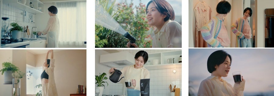 「毎日を、自分らしく過ごすこと」「無理せず、ラクに続けること」といったナレーションに合わせ、あらゆるシーンで自然体な姿を見せる筧さん。醸し出す空気感とヘルシーなスタイル、そしてナチュラルな笑顔で、”C COFFEEのある生活”の魅力を伝えていただいています。