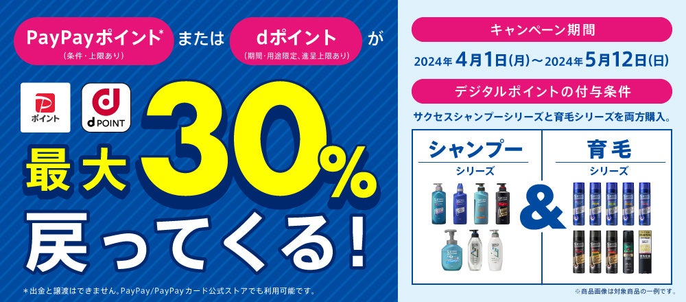 キャンペーン期間内で花王「サクセス」のシャンプーシリーズの商品と育毛シリーズの商品の両方を購入された方に、対象商品のお買い上げ金額に対して最大30%のPayPayポイント、またはdポイントを後日進呈します。 (2024年7月末までの順次進呈予定)