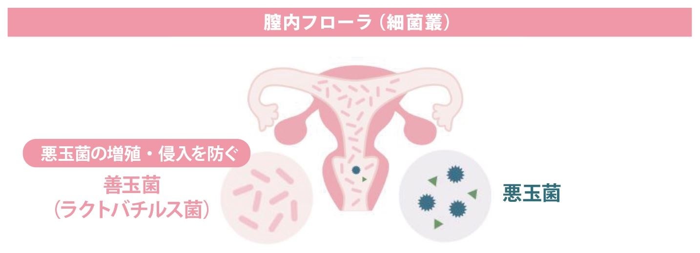 善⽟菌である「ラクトバチルス菌」は、健康な膣内フローラに多く存在し膣内を弱酸性に保つことで、雑菌の侵⼊を防ぐ役割を持っています。さまざまな要因でラクトバチルス菌が減少すると、悪⽟菌が増殖し、不妊リスクや感染症などの婦⼈科系疾患、膣トラブルの発⽣につながる可能性があると考えられています。