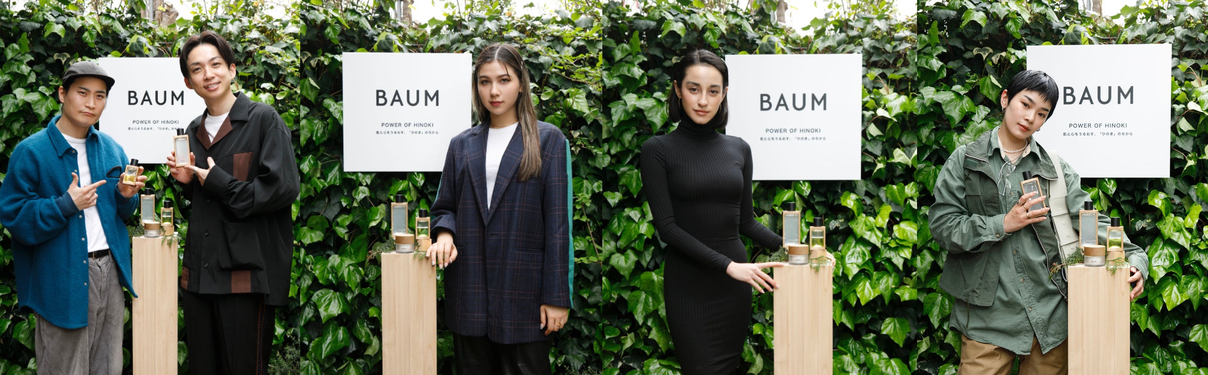 イベントには、アインシュタインの河井ゆずるさんや、きつねの大津広次さん、モデルの長谷川ミラさんをはじめ、抽選で選ばれたBAUM愛用者など多くのゲストが来場。イベント会場である「AEAJグリーンテラス」は国産ヒノキの組積構造が印象的な建築家 隈研吾氏による設計で、空間に足を踏み入れた瞬間に、清々しく美しいひのきを香りと視覚で体験。会場内ではスキンケアラインのタッチアップにより、リニューアルの進化を実感いただいた他、バリエーション豊かな精油の香りを試せる「アロマラボラトリー」でのひのきの香りレクチャー、うるおい溢れるひのき水に耳を澄ます、水琴窟のライブや、ひのきの豊かさを味わえるフィンガーフードやドリンクが提供され、五感でひのきをお楽しみいただきました。