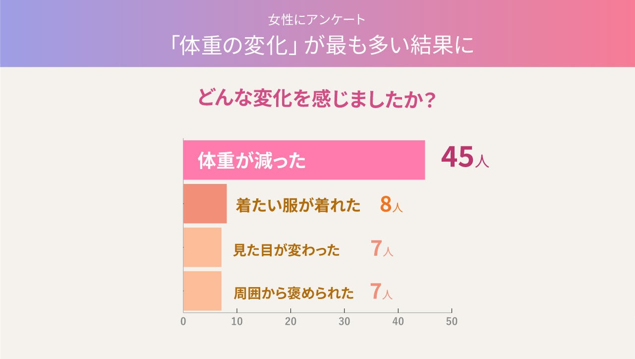 -回答者の声を抜粋- ・半年で3kg痩せることに成功した。おしりや腕、脚が引き締まりピッタリとした服を着れるようになった(20代/無職) ・2ヶ月で体重が3キロ減り、ぽっこりお腹が目立たなくなりました。(40代/会社員) |