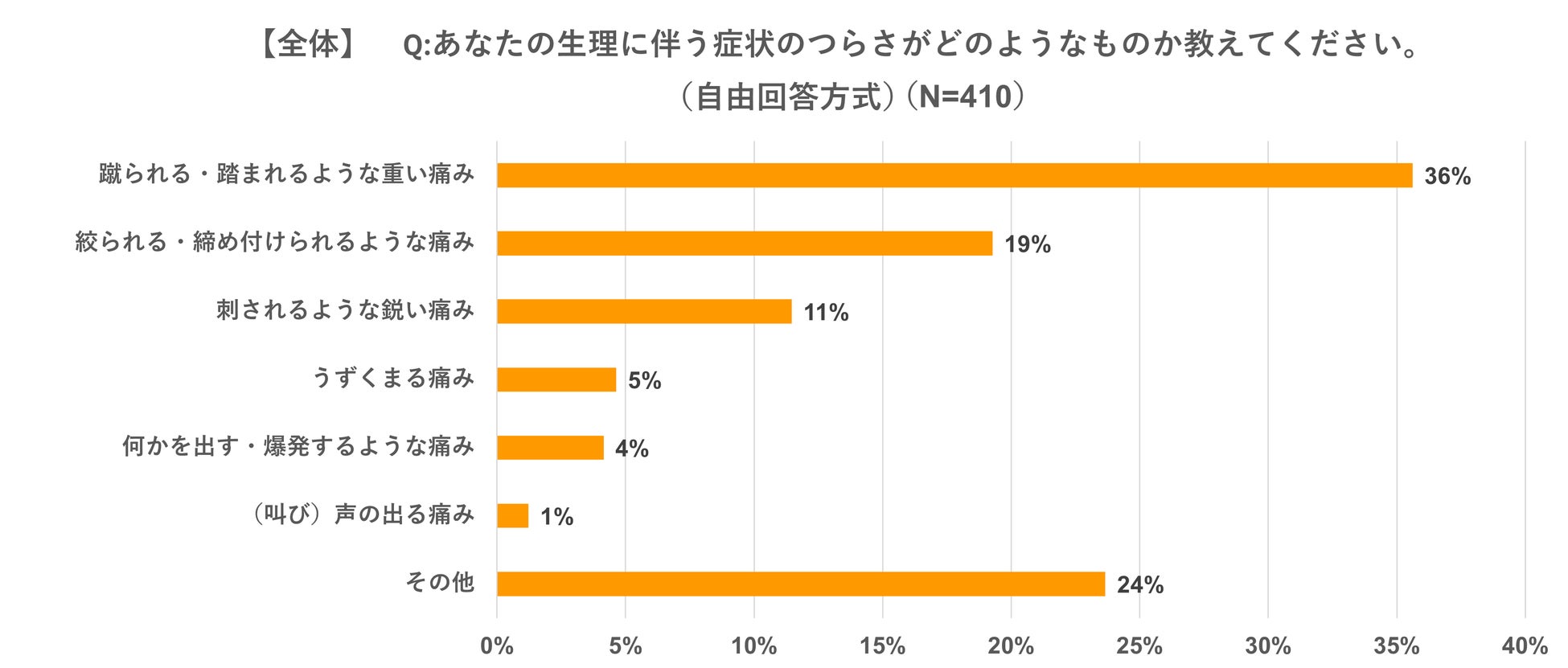 次に、生理に伴う症状のつらさを自由回答形式で回答してもらいました。「蹴られる・踏まれるような重い痛み」がある方が36%と最も多く、次いで「絞られる・絞めつけられるような痛み」が19%、「刺されるような鋭い痛み」が11%、「うずくまる痛み」が5%、「何かを出す・爆発するような痛み」が4%、「(叫び)声の出る痛み」が1%、「その他」が24%でした。このように多くの人が「痛み」に悩んでいる事が分かります。