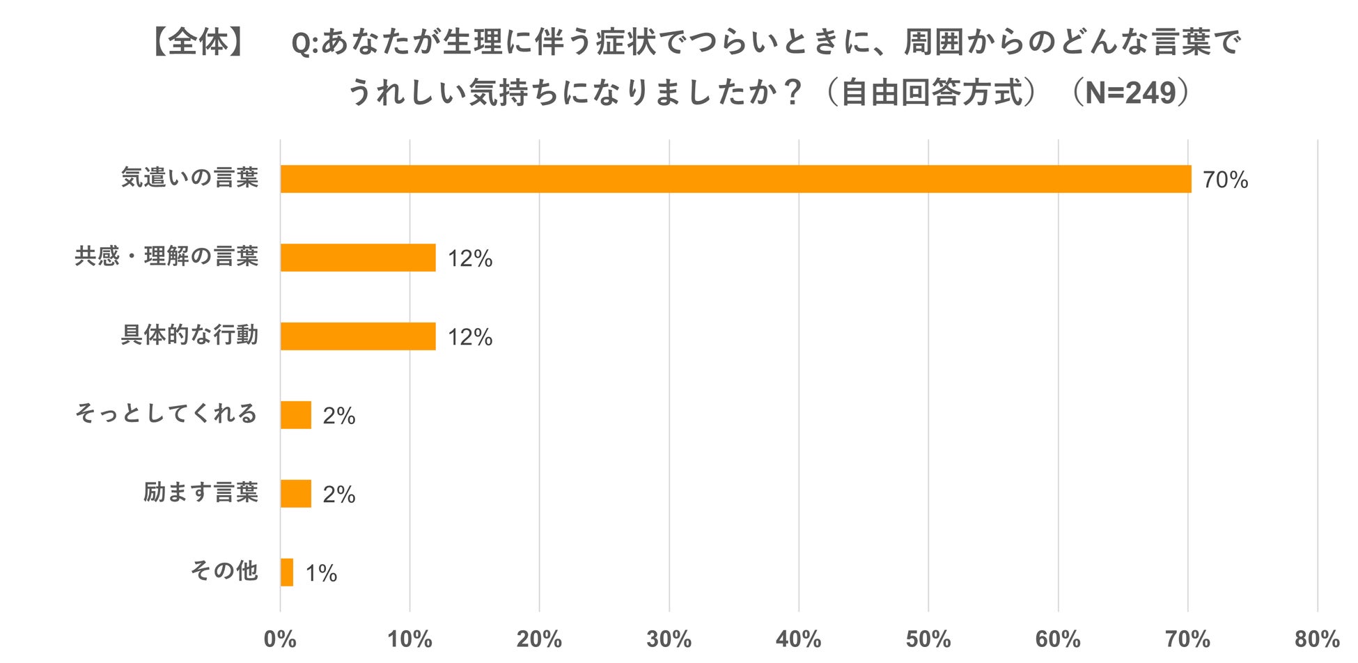 次に、生理に伴う症状でつらい思いをしているときにかけられた言葉で、うれしい気持ちになった言葉を自由回答形式で回答してもらいました。「気遣いの言葉」が最も多く70%、次いで「共感・理解の言葉」が13%、「具体的な行動」が12%、「そっとしてくれること」、「励ます言葉」がそれぞれ2%、「その他」が1%でした。