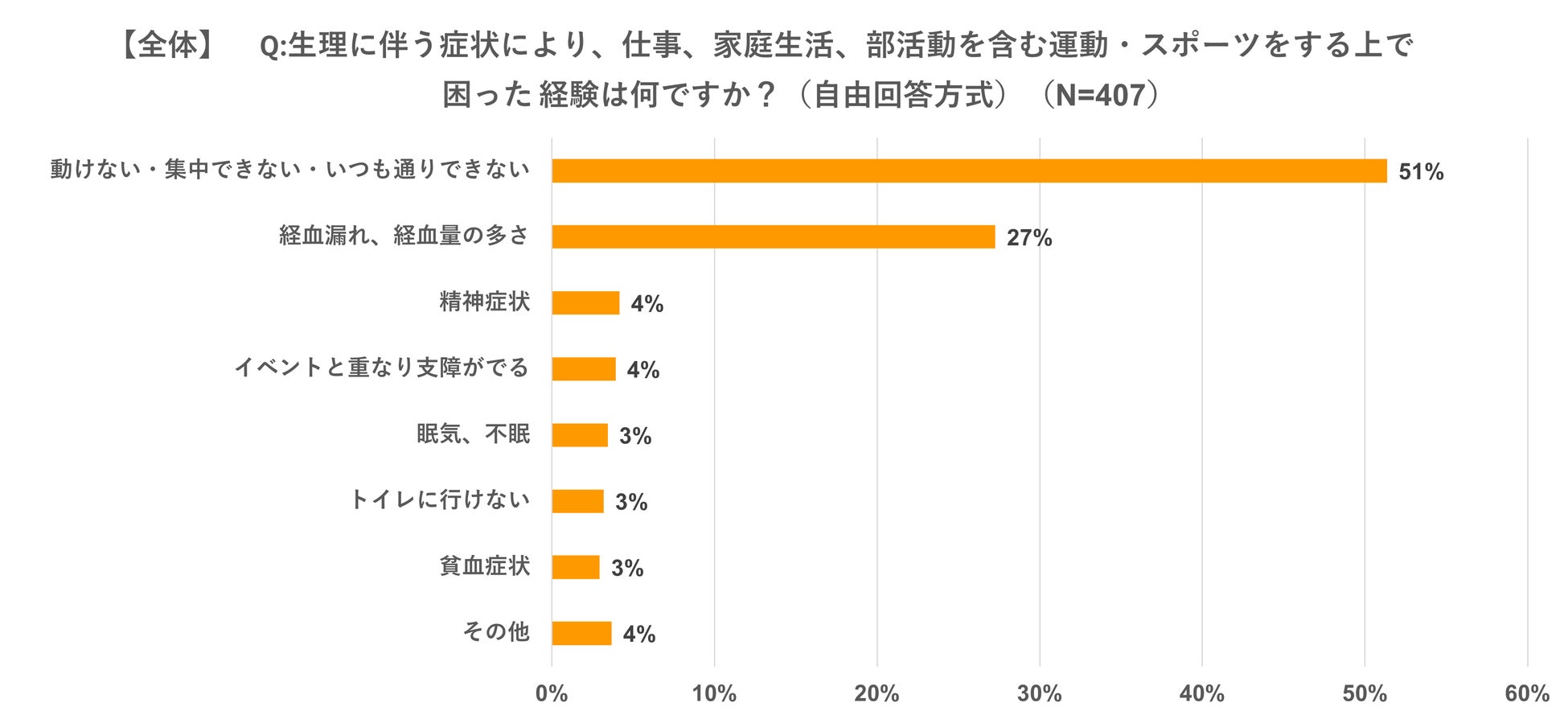 生理に伴う症状により、困った経験を自由回答形式で回答してもらったところ、「動けない・集中できない・いつも通りできない」が51%と最も多く、次いで「経血漏れ、経血量の多さ」が27%と、この2つが特に多い回答となりました。回答の中には「腹痛に発熱、体のだるさが伴い、出勤して仕事に集中することが難しかったが、毎月それで休むこともなかなかできなかった。」といった経験談もあり、生理に伴う困った経験は予想以上に深刻である事例もありました。