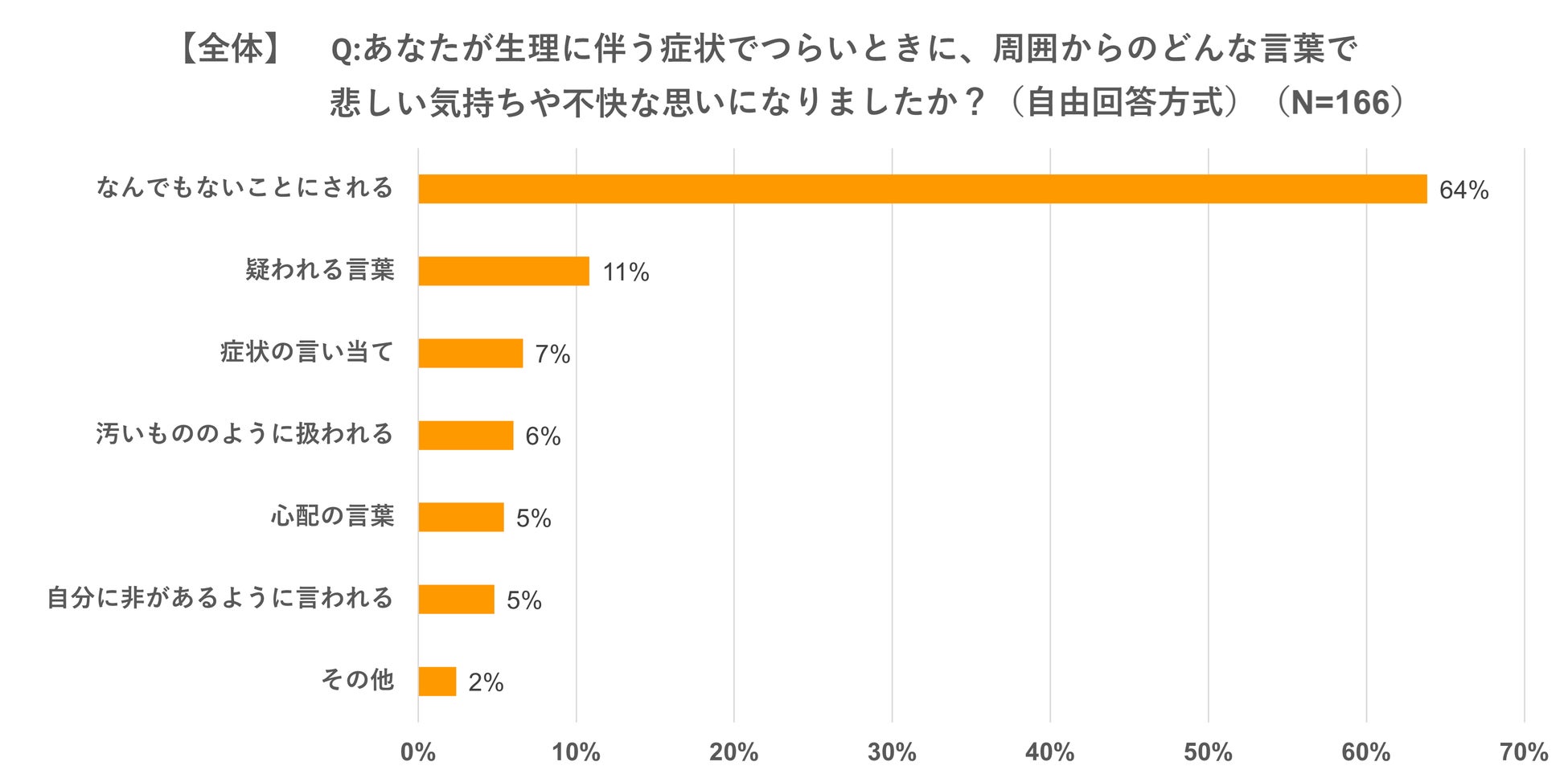 生理に伴う症状でつらい思いをしているときにかけられた言葉で、悲しい気持ちや不快な思いになった言葉を自由回答形式で回答してもらったところ、。「なんでもないことにされる言葉」が最も多く64%、次いで「疑われる言葉」が11%でした。そのほか、「症状の言い当て」が7%、「汚いもののように扱われる言葉」が6%、「心配の言葉」と「自分に非があるように責められる言葉」がそれぞれ5%、「その他」が2%でした。回答の中には「自分は生理が軽いという女性の言葉がつらい」、「私はそんなに痛くないけど、そんなに酷いの?といわれるとつらかった」のように、症状の軽い女性からの言葉で悲しい思いをした経験談もありました。