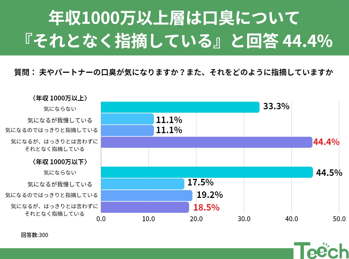 調査結果によると、年収1,000万円以上の人たちは、パートナーの口臭が気になる時、他のどの年収層よりも「それとなく指摘している」と答える割合が高いことが分かりました。その割合はなんと44.4%と半数近い数字となりました。