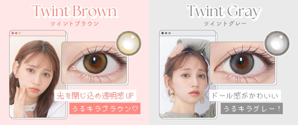 瞳の輪郭をちょっぴり強調するフチデザインや、輝き感をUPするドットがぎゅっと詰まったメインデザインにもこだわった新感覚のツインティントカラコン。
