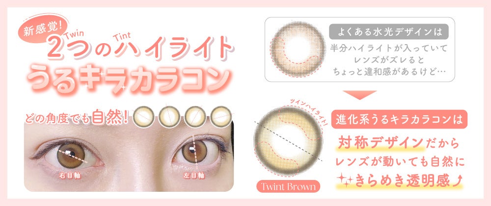 従来の水光系カラコンは“レンズデザインの半分のみ”にハイライトが入ることが多く、「レンズが左右上下でずれると見え方に違和感を感じる」という声も…!今回の新色は、2つの対称ハイライトデザインだからレンズがどの角度に動いても不自然な見え方にならない♪