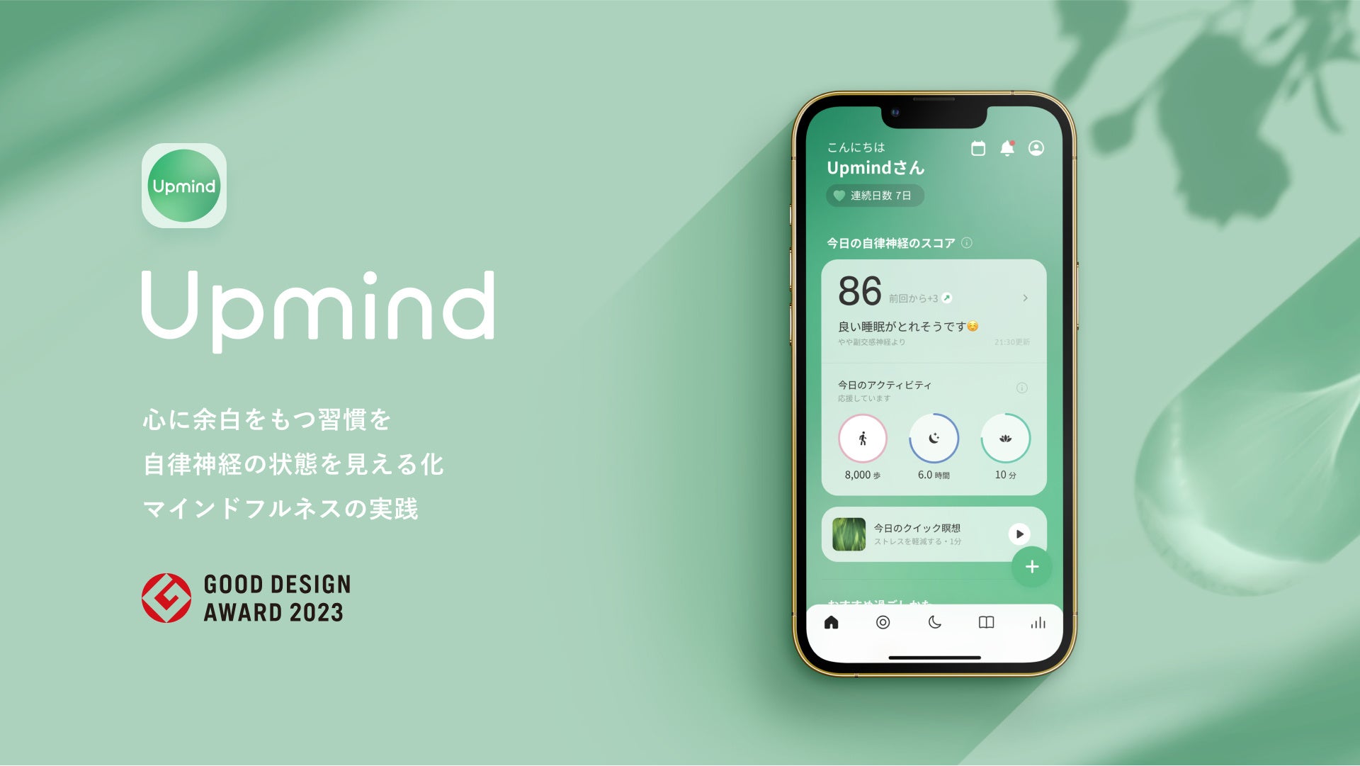 主に、国内発のマインドフルネスアプリとして、最大のサービス(ダウンロード・レビュー数NO.1*)となる「Upmind」を開発・運営(東京大学滝沢龍研究室とも共同研究、2023年グッドデザイン賞を受賞)。