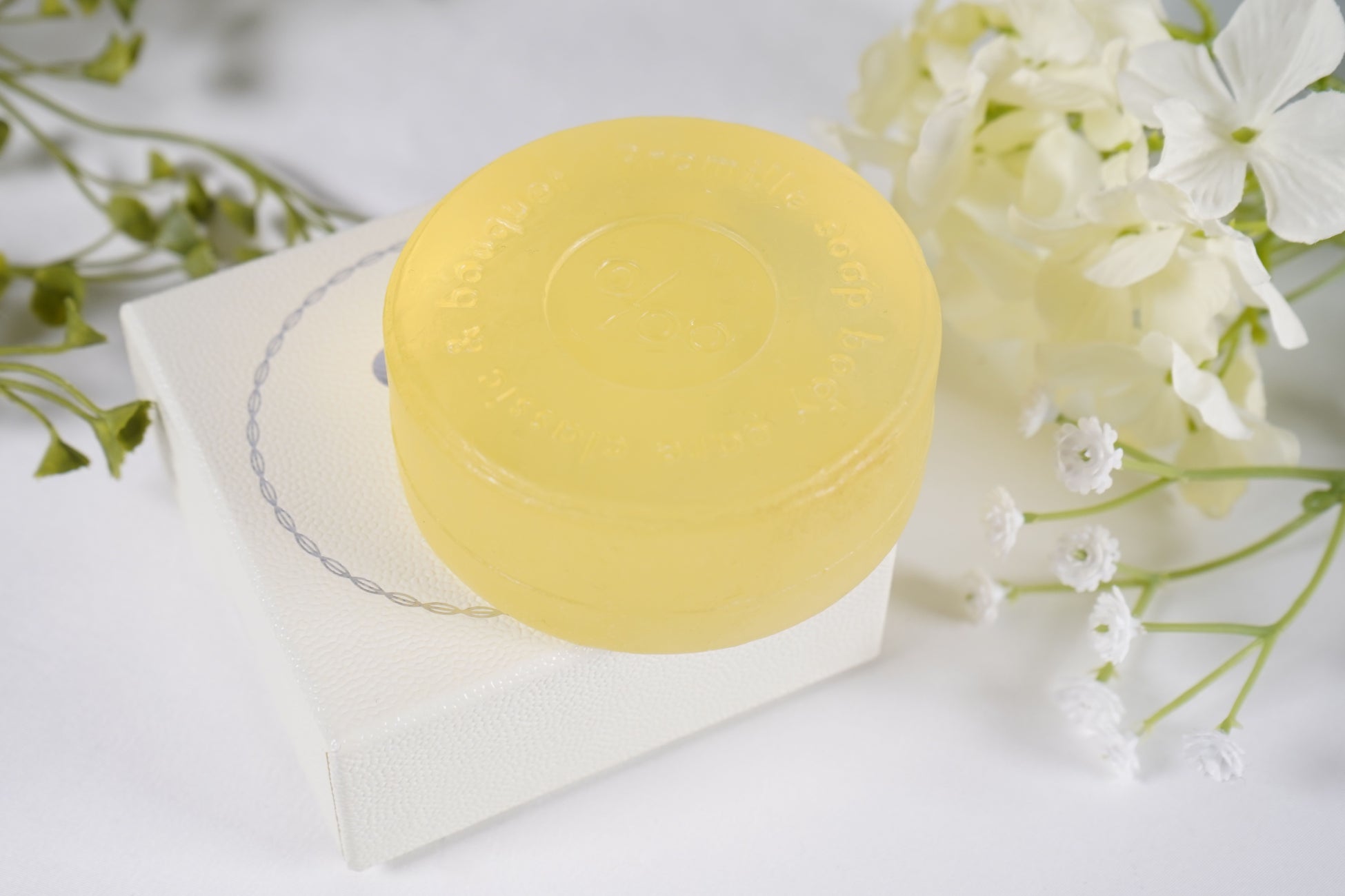 『プロミルオイル』をモチーフにした透明感のある淡いイエローの石けんには、ブランドロゴを刻印しました。シックなレザー調のボックスにシルバーの箔押しをした高級感のあるパッケージは、自分へのご褒美にも、大切な人へのギフトにもおすすめです。