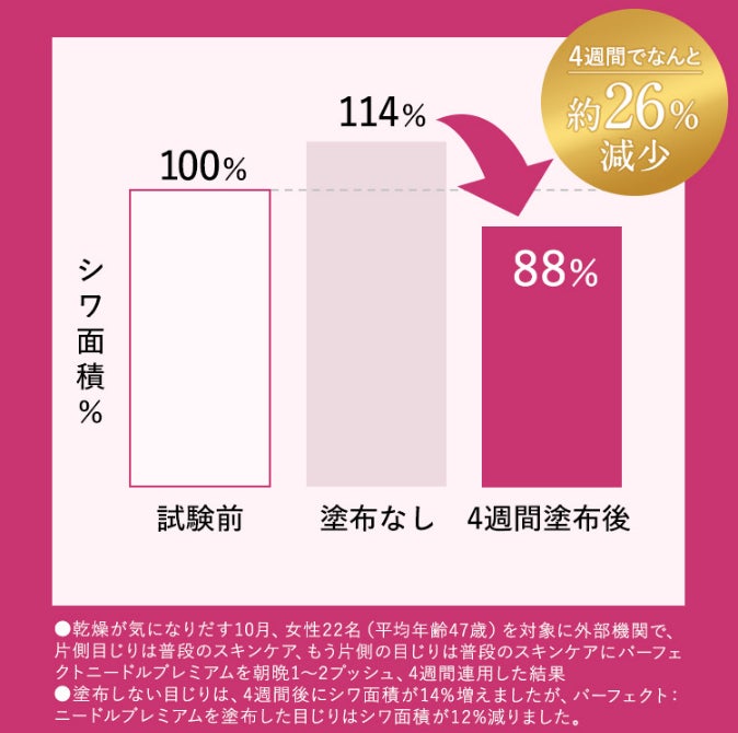 FABIUS は、美容大国ともいわれる韓国で人気の針美容とヒト幹細胞由来成分に注目し、適度な刺激感をもたらすミネラル由来の美容針(ニードル)を配合した美容クリーム『パーフェクトニードル』を 2020年に発売しました。パッチタイプよりも肌へのニードル接触量を調整しやすく、刺激を強く感じやすい肌でもマイルドな使用感となるよう処方設計しており、出荷累計 32 万本*1 に及んでおりました。一方で近年、さまざまなニードルコスメが開発・注目される中、FABIUS では年齢に応じたスキンケアを強化するため、美容成分として話題のナイアシンアミド(整肌成分)を追加配合した『パーフェクトニードル プレミアム』として2023 年 1 月 20 日にリニューアルしました。お客様からは「使い続けるとシワが薄くなってきた」「はり感が出てきた」とのお声をいただいていたことから、乾燥小じわを目立たなくする効能を実証するため、抗しわ効能評価試験を行いました。