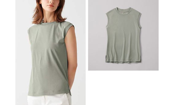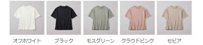 気になる二の腕や体型をカバーできる5分袖オーバーサイズTシャツとコーディネートしやすいノースリーブをラインアップ。サイドスリット入りで、ボトムにインしても出してもよい使いやすいデザインで、カラーは、ベーシックなオフホワイトとブラックにモスグリーン、クラウドピンク、セピアのアースカラーを加えた5色を展開。汗ばむ季節を快適に過ごせる便利な1枚です。