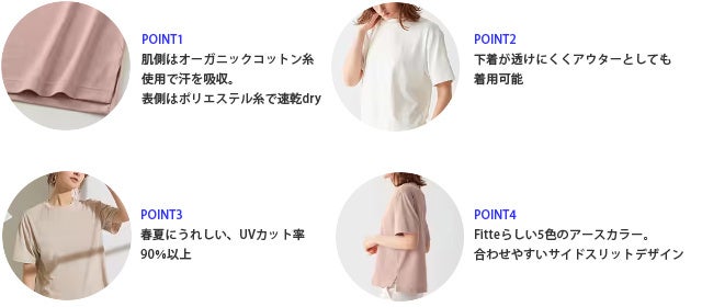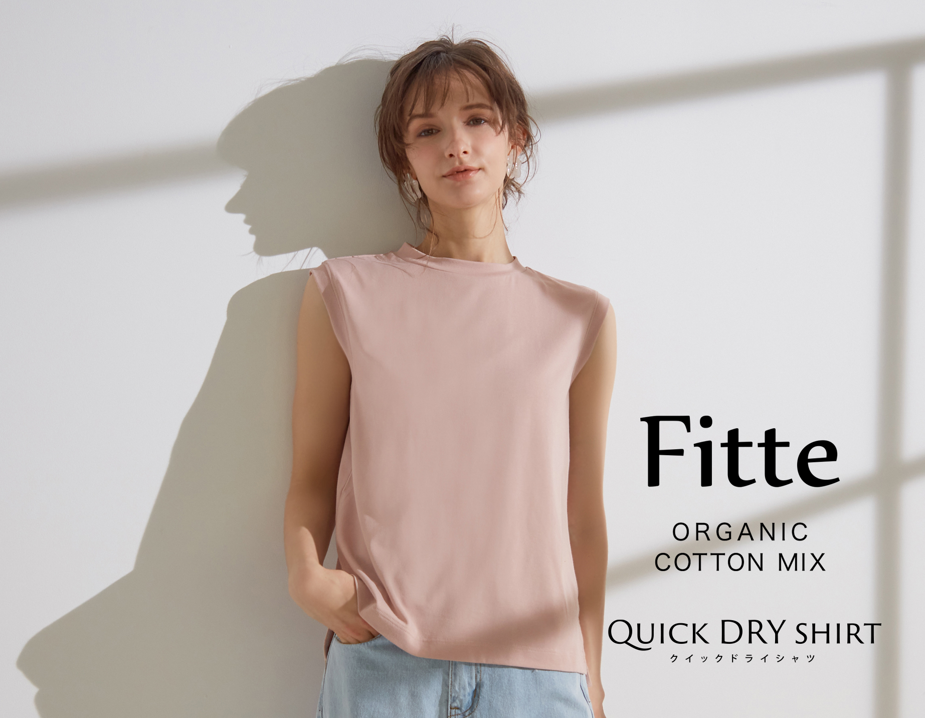 オーガニックコットン混素材や快適な着心地が人気のレディスインナーグループ「Fitte」。この度発売した「Fitteクイックドライシャツ」は、汗じみや下着の透けなど春夏用アウターTシャツの不満に着目して開発しました。肌側がオーガニックコットン100%で汗をしっかり吸収、表側を速乾性のあるポリエステルにすることで早く乾き、リバーシブル天竺編みで気になる下着の透けを軽減。インナーウェアに求められる吸汗速乾機能と、アウターTシャツにほしい「透けにくさ」を両立させた1枚で着られるベーシックTシャツです。