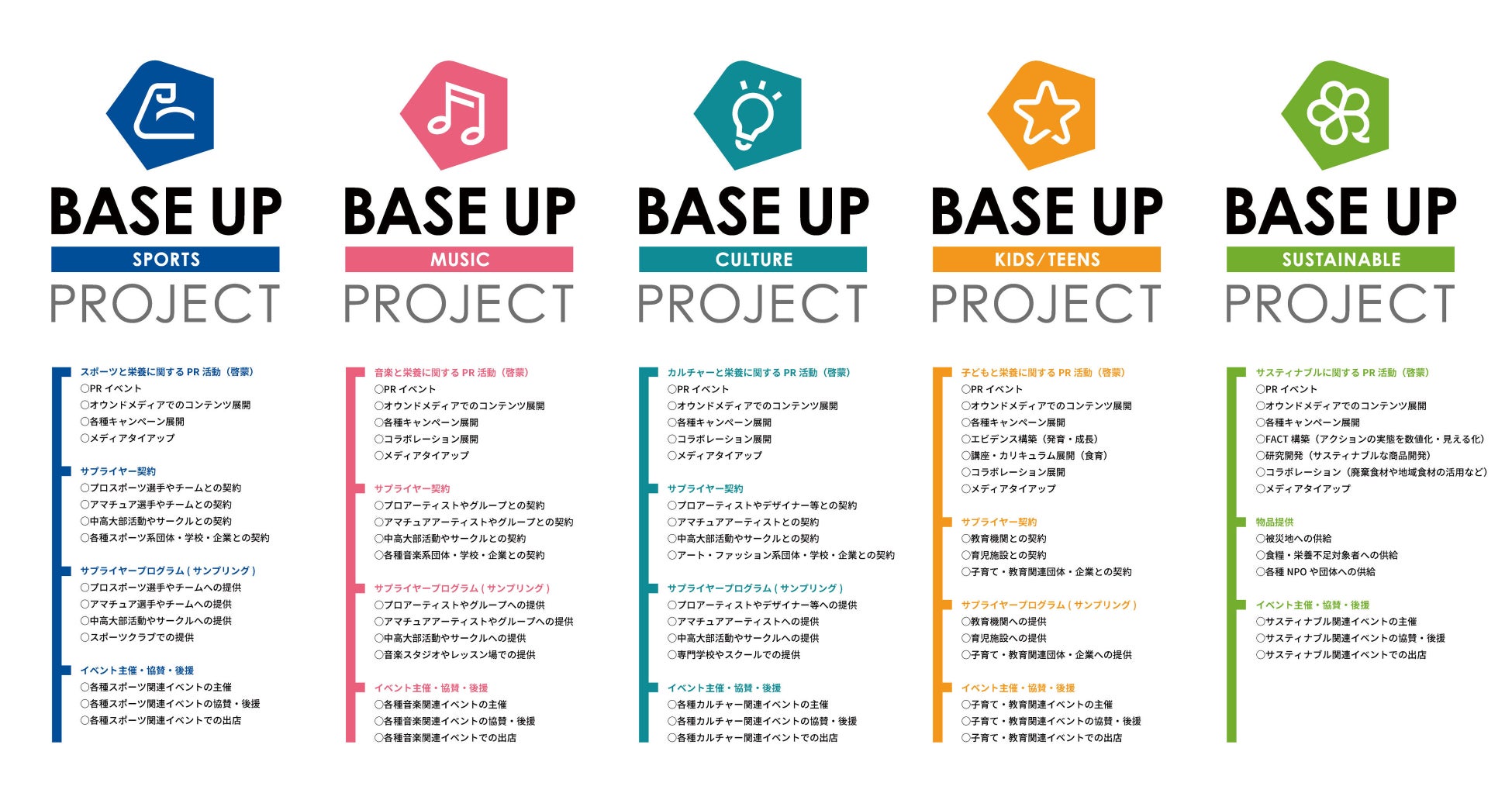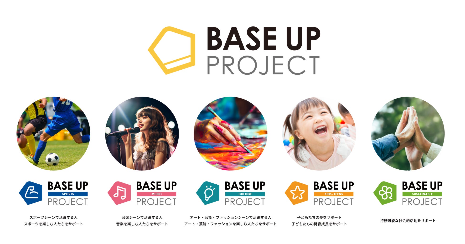 本プロジェクトでは、スポーツ、音楽、芸術、カルチャーなどのシーンで活躍する人たちやそれらを楽しむ人たち、夢を実現するために頑張っている方々、そしてサスティナブルな社会の実現に向け、「栄養」「健康」という側面から応援、サポートしていきたいと考えています。“明日の笑顔を皆さんと共に”そんな想いが込められた「BASE UP PROJECT」です。