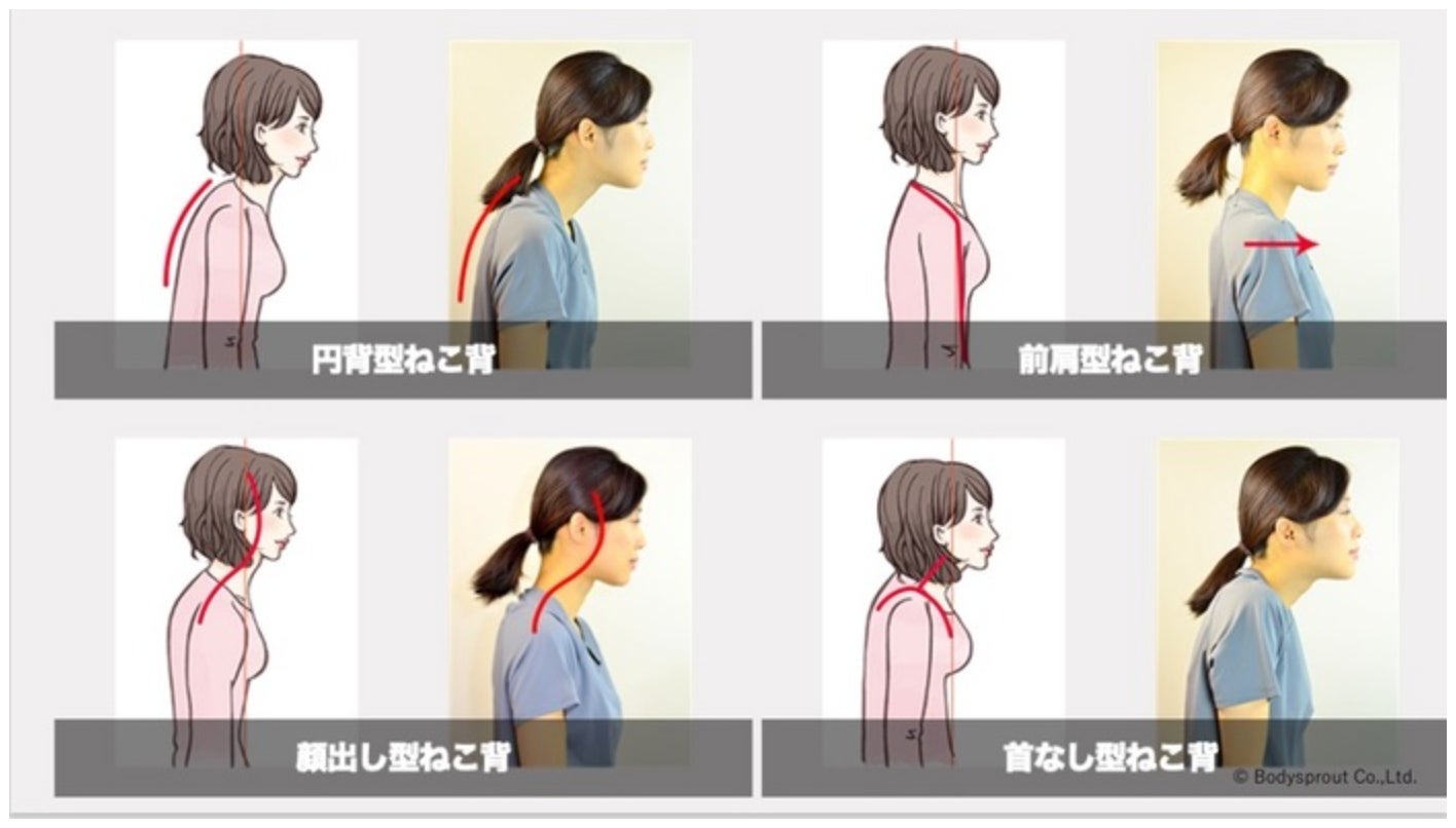 まず、背中が全体的に丸まっている「円背型ねこ背」、肩が前方に出ている「前肩型ねこ背」、顔が前方に出ている「顔出し型ねこ背」、首が埋まっている「首なし型ねこ背」です。