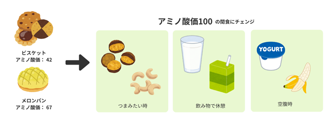 ビスケットや菓子パンなど小麦を使ったお菓子類はアミノ酸価が60前後と低いので、トリプトファンを多く含む製品として、乳製品、大豆製品、ナッツ類に置き換えてみませんか。
