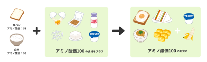 必須アミノ酸には、たんぱく質とのバランスを測るアミノ酸価という指標があり、100点に近いほどよいとされています。アミノ酸価が80以上の食材として、牛乳、卵、肉(牛、豚、鶏)、魚介(サケ、アジ、エビ、アサリ)、大豆製品などが挙げられます。