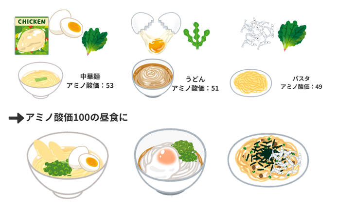 昼食の定番食材のうどんや中華麺、スパゲッティは、アミノ酸価が50前後のため、トッピングや小鉢を添えてアミノ酸価をアップさせましょう。