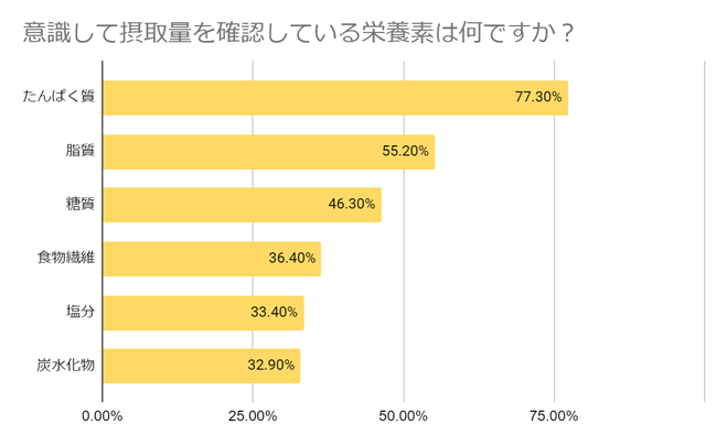 2023年8月にカロミルユーザー1,122名に行ったアンケート調査によると、回答ユーザーの約8割弱(77%)が摂取量を意識して確認している栄養素として「たんぱく質」を挙げました。