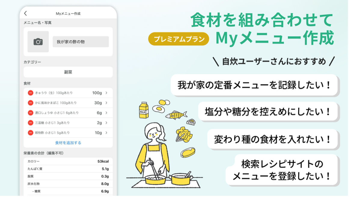 さらに、カロミルの有料サービス「プレミアムプラン」をご利用いただくと、自分のレシピに合わせた食材を組み合わせて「Myメニュー」を登録することができます。あなたにピッタリの”幸せになる食事”を「Myメニュー」に登録しておくだけで、ワンタップで簡単に記録できますよ。
