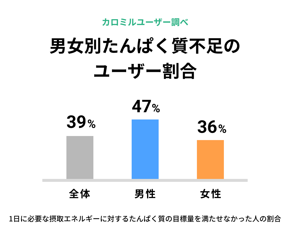 また、2022年に行ったカロミルユーザーのたんぱく質の摂取状況調査では、回答ユーザーの約4割(39%)が1日に必要な摂取エネルギーに対するたんぱく質の目標量を満たしていないことがわかりました。これらの調査結果から、日頃からたんぱく質をしっかり摂取することを意識をしながらも、実際に摂取するとなると苦労していることがわかります。