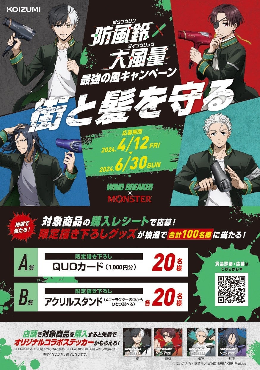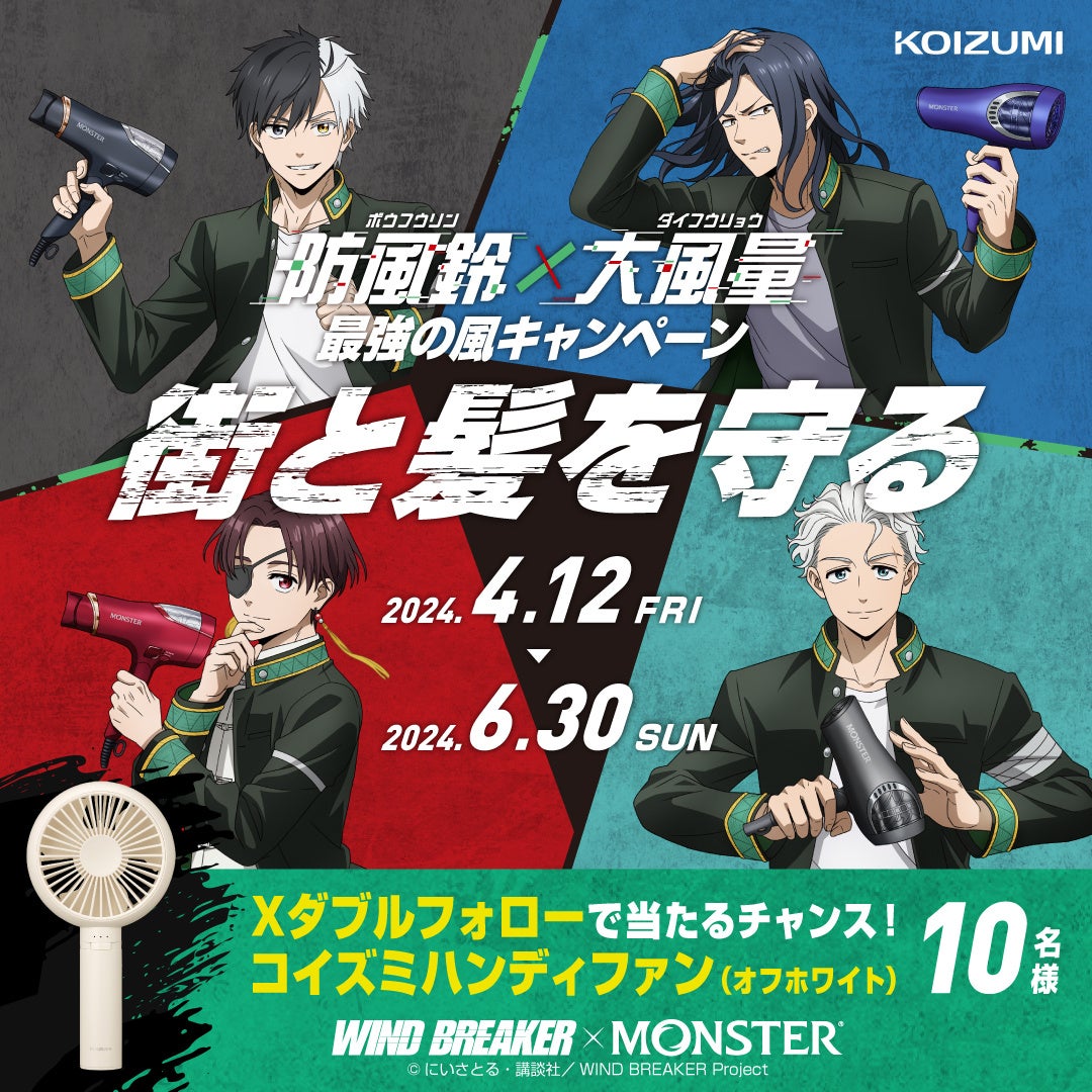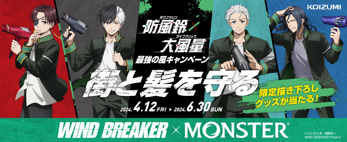 小泉成器株式会社(本社:大阪市中央区備後町、代表取締役社長:橋本直志)は、ダブルファンがつくるパワフルな大風量ドライヤー『MONSTER』広告プロモーションの一環として、TVアニメ『WIND BREAKER』とコラボした「最強の風キャンペーン」を4月12日より実施いたします。