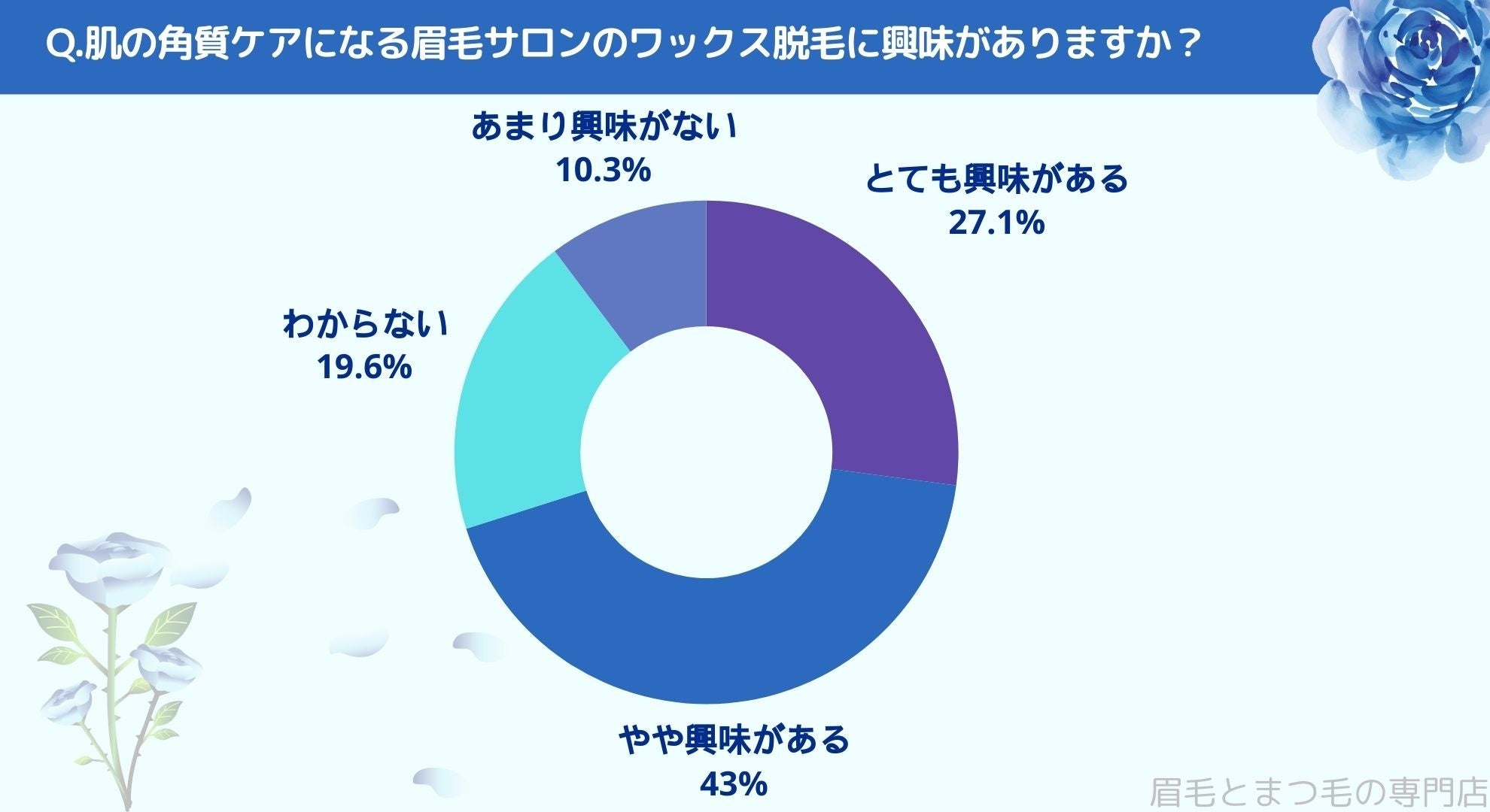 肌の角質ケアになる眉毛サロンのワックス脱毛に興味があるかお聞きしたところ「とても興味がある(27.1%)」、「やや興味がある(43%)」、「わからない(19.6%)」、「あまり興味がない(10.3%)」という結果になりました。