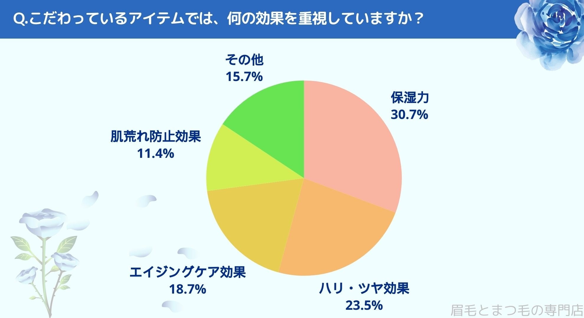 こだわっているアイテムで重視している効果をお聞きしたところ「保湿力(30.7%)」、「ハリ・ツヤ効果(23.5%)」、「エイジングケア効果(18.7%)」、「肌荒れ防止効果(11.4%)」、「その他(15.7%)」という結果になりました。