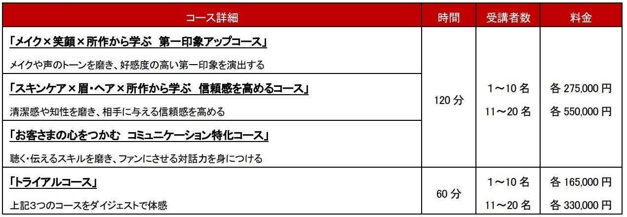 当社はこれらの要望に応えるべく、企業の従業員および経営層・管理職など、幅広いビジネスパーソンが自分をより魅力的に演出し、お客さまの心をつかむ技術を学べる研修プログラムを開発しました。