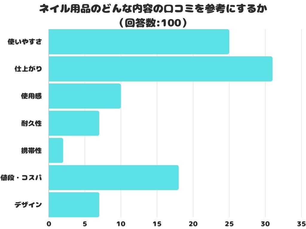 ネイル用品のどんな内容の口コミを参考にするかをアンケートにて調査したところ、1位は「仕上がり」でした。