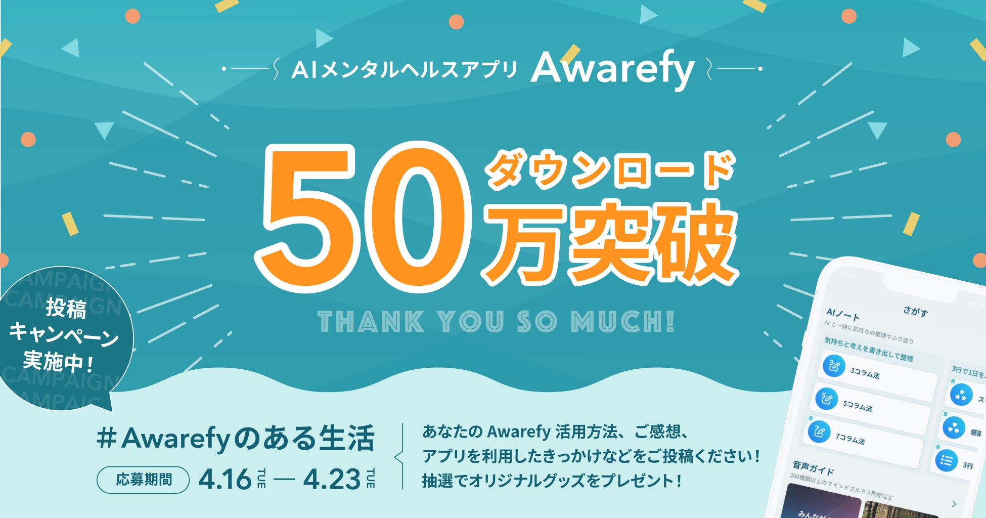 この度、AIメンタルヘルスアプリAwarefyが、累計50万ダウンロードを突破いたしました!
