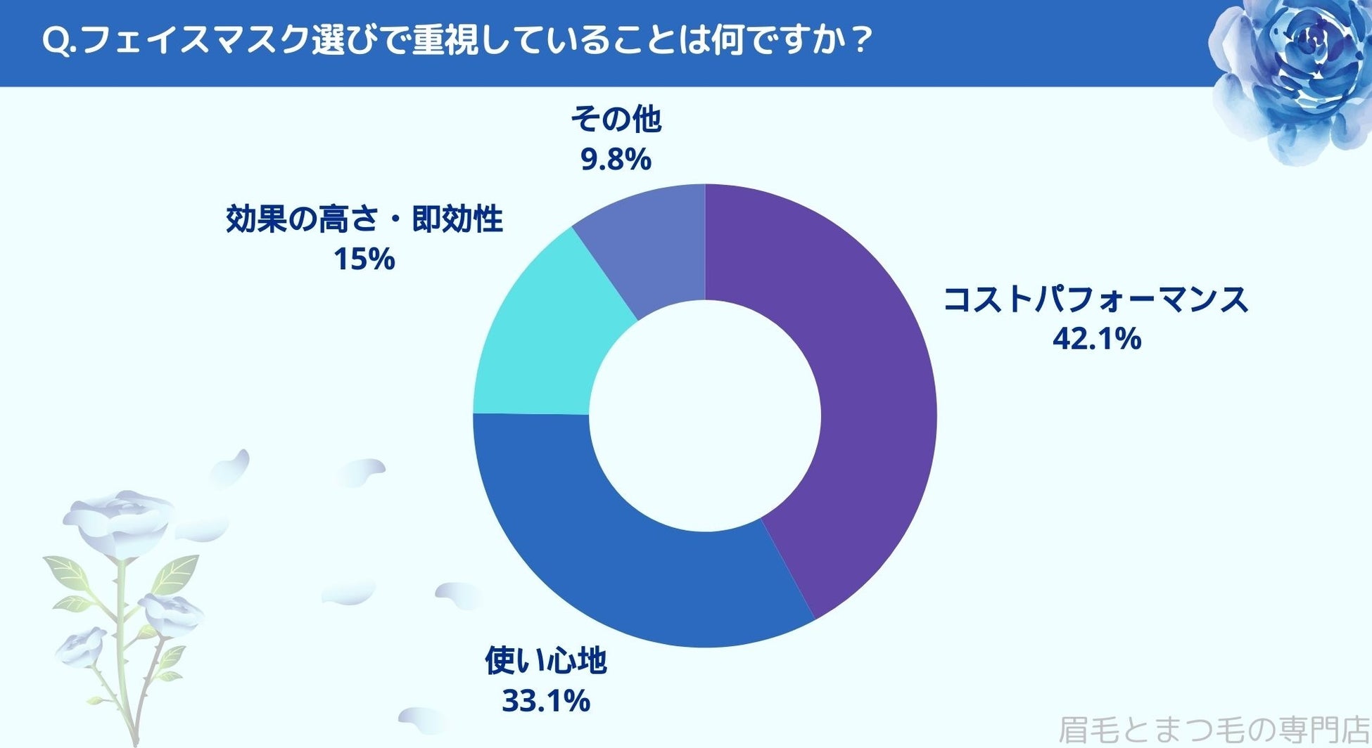 フェイスマスク選びで重視している効果をお聞きしたところ「コストパフォーマンス(42.1%)」、「使い心地(33.1%)」、「効果の高さ・即効性(15%)」、「その他(9.8%)」という結果になりました。